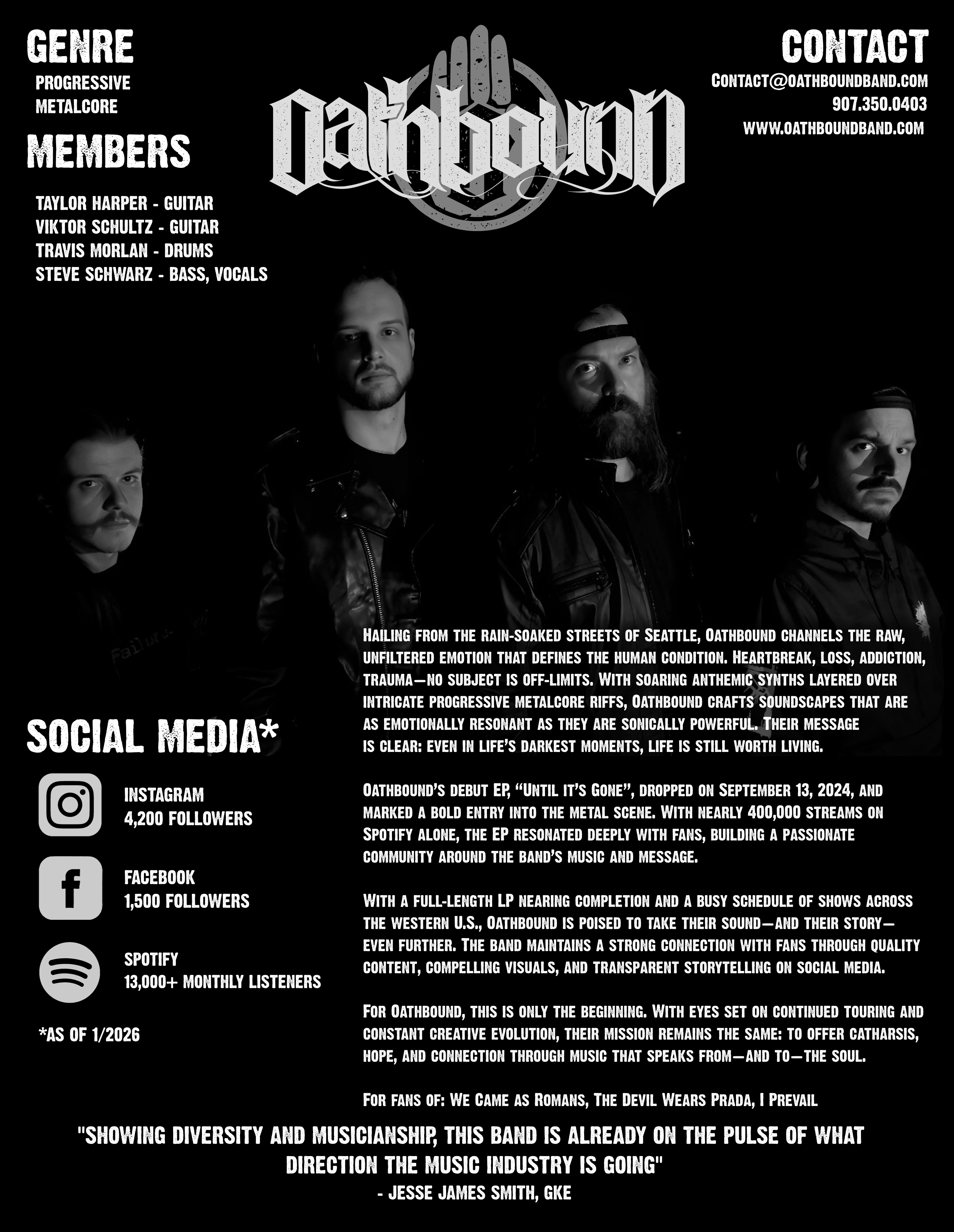 Hailing from the rain-soaked streets of Seattle, Oathbound channels the raw, unfiltered emotion that defines the human condition. Heartbreak, loss, addiction, trauma—no subject is off-limits. With soaring anthemic synths layered over intricate progressive metalcore riffs, Oathbound crafts soundscapes that are as emotionally resonant as they are sonically powerful. Their message is clear: even in life’s darkest moments, there’s a silver lining—and a life still worth living.